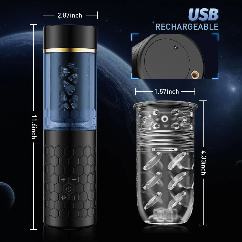 A hands-free automatic masturbator for those who are tired of jerking off with their hands and seek more accessories for solo play. When you open the masturbation cup, the automatic thrusting action and rich pellets lick your cock like crazy, stimulating every sensitive spot, and the gentle inner vaginal texture will make you feel like you're in a real pussy. The firm suction base allows you to place this penis massager on any smooth and hard surface, unlocking more locations like sticking this penis massager to a bedroom or bathroom wall. This is a realistic way to use penetrative sex. The hexagonal texture is non-slip and easy to grip to prevent falls.
